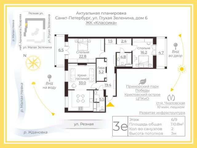 Арт. 124618371 Предлагаем вашему вниманию видовую квартиру в самой престижной части Петроградской стороны! В квартире общей площадью 110.8м2 предусмотрены две отдельные спальни с просторными лоджиями, а также кухонная зона, объединенная с гостиной. Двухстороння планировка продумана до мелочей здесь много зон хранения, включая вместительную гардеробную, два отдельных санузла (с ванной и душевой). Квартира располагается на 6 этаже, из окон открываются приятные виды: окна кухни-гостиной и основной спальни выходят в сторону Малой Невки; вторая спальня в тихий закрытый двор. Высота потолков 3 м. Проведена система кондиционирования. Теплые полы в санузлах и лоджиях. Ремонт обновлен в 2024 году. Актуальная планировка полностью узаконена и отражена в документах! ЖК Классика комплекс домов, построенных по кирпично-монолитной технологии. Территория ограждена и обеспечена круглосуточной охраной с системой видеомониторинга. На территории расположены частные детские сады, магазины, студии йоги и пилатеса, медицинские центры, салоны красоты и рестораны. Во дворе детская площадка. В вечернее время фасады домов должны выделятся среди соседней застройки художественной оформлением подсветки. Комплекс расположен в одной из лучших частей Петроградской стороны. В двух минутах от вас прогулочная набережная Малой Невки; в шаговой доступности парки Крестовского и Каменного островов. Главная ресторанная улица Большая Зеленина буквально за поворотом. Лучшие частные и государственные школы, детские сады в непосредственной близости. Звоните уже сегодня, чтобы узнать подробности и записаться на просмотр!