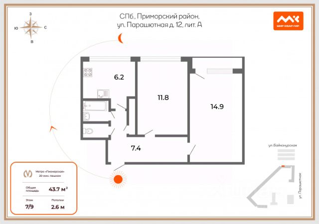 Объект готовится к просмотрам, идёт фотосессия. Арт. 124156018 Продается уютная двухкомнатная квартира в Приморском районе Санкт-Петербурга! Предлагаем вашему вниманию отличный вариант для комфортной жизни в одном из самых престижных районов города. Эта светлая и солнечная квартира находится по адресу: ул. Парашютная, д. 12, лит. А, кв. 527, всего в 20 минутах ходьбы от станции метро "Пионерская". Преимущества: - Развитая инфраструктура: магазины, школы, детские сады и другие объекты социальной инфраструктуры находятся в шаговой доступности. Основные характеристики: - Общая площадь: 43,7 м² - Этаж: 7 (панельный дом) - Комнаты: 2 - Балкон: есть - окна квартиры выходят на мечеть - Выполнен косметический ремонт Особенно стоит отметить живописный зеленый двор с детской площадкой, который радует глаз в летнее время и служит прекрасным местом для прогулок и отдыха. Квартира идеально подходит как для собственного проживания, так и для инвестиционных целей. Один собственник, обременения отсутствуют, документы в порядке. Не упустите возможность стать владельцем этой прекрасной квартиры в одном из лучших районов города! Звоните, и мы с удовольствием организуем для вас просмотр. Воплотите мечту о комфортной и уютной квартире в реальность! Предлагаем ПРЕМИАЛЬНОЕ обслуживание для требовательных клиентов. Оперативно организуем просмотр, предоставим полную информацию по объекту. 20 лет работы с требовательными клиентами подготовили нас к решению ВАШИХ сложных задач. Будем рады знакомству! Ул. Рубинштейна, д.8.