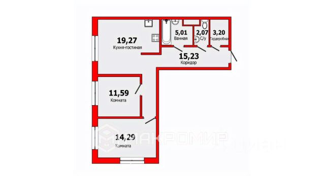Однокомнатная квартира общей площадью 41,2 кв. м.