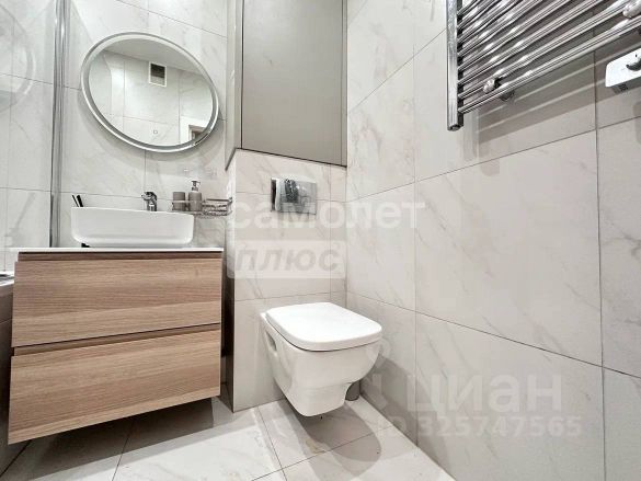 Совмещенный санузел. Подвесной шикарный унитаз, полотенцесушитель, ванна со стеклянной шторой, двойной душ, зеркало с подсветкой.