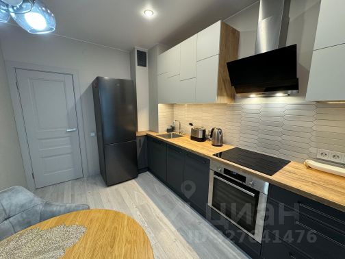 Современная кухня-гостиная с функциональной гарнитурой, встроенной качественной техникой (духовка, варочная панель, посудомоечная машина, вытяжка, холодильник). Дополнительная подсветка в кухонном гарнитуре. Диван раскладной, вместимость до 2х спальных мест и с местом для хранения. Большой обеденный стол из натурального дерева.