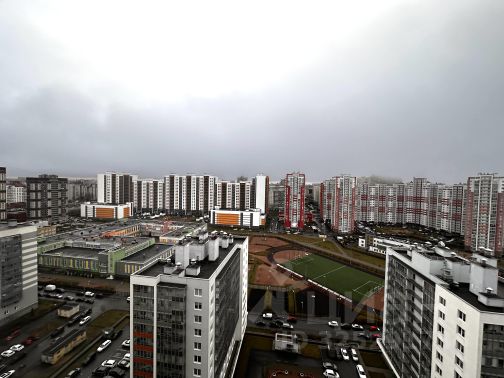 Квартира на высоком этаже с видом на благоустроенный двор и панораму района.