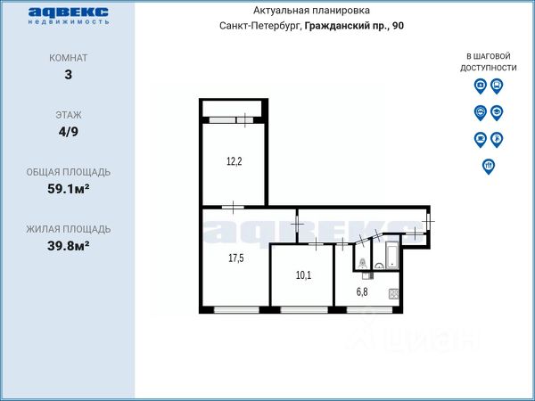 Микрорайон обжитый: до ближайшего продуктового супермаркета - 300 метров, до взрослой и детской поликлиник 500 метров, до школы 300 метров, до детского садика 600 метров, до музыкальной школы 800 метров, рядом с домом детская площадка, в 500 метрах, на краю соснового парка спортивный комплекс Зенит, в шаговой доступности, на пр. Науки множество различных магазинов.