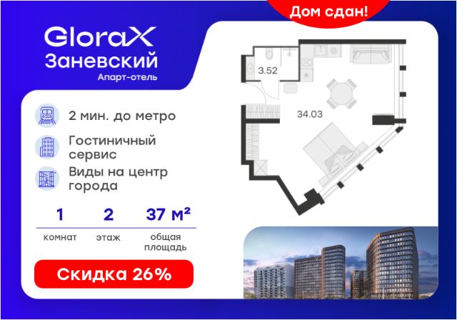 Продается апартамент-студия на 12-м этаже в сданном Апарт-комплексе бизнес-класса "GloraX Заневский". Ключи сразу! Общая площадь лота составляет 32,92 кв. м, из которых 23,72 кв. м отведено под жилую. Номер апартамента - 1 201. Преимущества: - Полная чистовая отделка - Возможность покупки меблировка и техника - Вход по ключ-карте - Прачечная на 1 этаже - Возможность дозаказа отельного сервиса - Программы доходности - Летний бар и променад - Воркаут площадка - Pet-friendly Апартаменты "GloraX Заневский" - проект бизнес-класса с развитой инфраструктурой, удовлетворяющей все потребности самых взыскательных гостей. Располагается в одном из наиболее перспективных, районов Петербурга в 2х минутах от метро "Ладожская" и в 10 минутах от Невского проспекта. В "GloraX Заневский" есть все, что необходимо для комфортной жизни, работы и отдыха. Инфраструктура, покрывающая все потребности и ожидания собственников и арендаторов. В радиусе 150 метров находятся супермаркеты с возможностью доставки продуктов прямо до дверей апартаментов. На 1000 кв. м. общественных пространств расположится уютный лобби-бар, ресторан мировой кухни на 80 человек и оборудованные коворкинги. В апартаментах "GloraX Заневский" выполнена современная отделка с использованием высококачественных экологичных материалов. В проекте предусмотрен подземный отапливаемый паркинг на 100 мест, куда можно спуститься на лифте прямо от дверей апартаментов. Узнайте подробности в Отделе продаж.