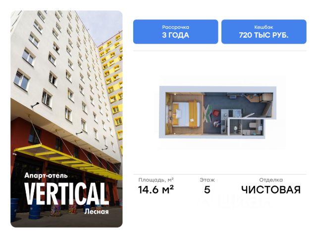 Продаются апартаменты общей площадью 20.60 м2, расположенные на 6 этаже в апарт-отеле нового формата Vertical Лесная. Помещение сдается с чистовой отделкой, мебелью и техникой. Vertical Лесная - это многофункциональный апарт-отель, объединяющий в себе все преимущества комфортной жизни. Удачное расположение рядом с центром города, современное креативное комьюнити, яркая узнаваемая архитектура и хороший сервис - каждая деталь Vertical Лесная формирует уникальную атмосферу для жизни и работы. Это место, где инновации встречаются с комфортом, а вдохновение становится частью повседневности. Отличная транспортная доступность: - 10 минут пешком до метро "Лесная"; - 20 минут пешком до метро "Выборгская"; - 10 минут на машине до Финляндского вокзала; - 20 минут на машине до Невского проспекта. Удачное окружение: - Живописный Петроградский остров; - 6 парковых зон, включая Ботанический сад академии С. М. Кирова; - Набережная Большой Невки; - 15 минут на машине до Петропавловской крепости; - 20 минут на машине до Зимнего дворца и Эрмитажа. Преимущества: - Мобильное приложение гостя и многофункциональный личный кабинет инвестора; - Современные системы безопасности; - Просторное лобби с баром; - Уютный коворкинг; - Собственный кинотеатр; - Фитнес-зал со всем необходимым оборудованием; - Уникальная Digital-Прачечная; - Ресепшен ответит на вопросы лично или в приложении в любое время, работают 24; - Активное сообщество резидентов.