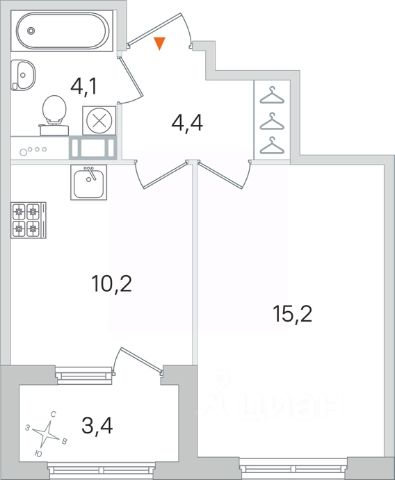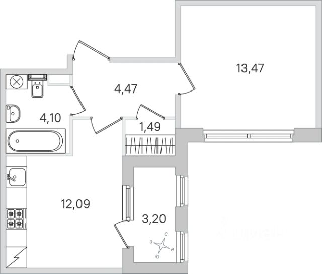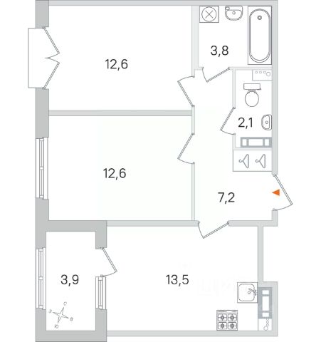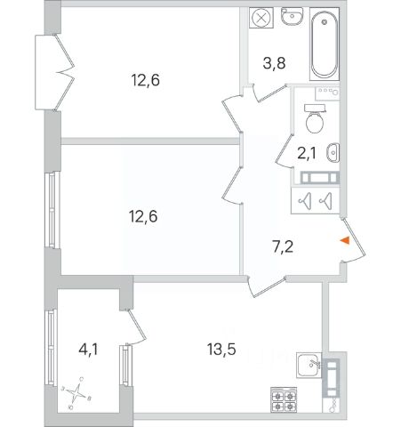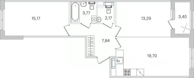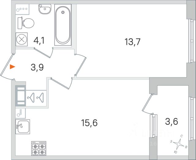 Эргономичная планировка: кухня-гостинная - 19,5 кв.м с выходом на балкон 3,6 кв.м., две квадратная комната 14,3+14,3 кв.м.