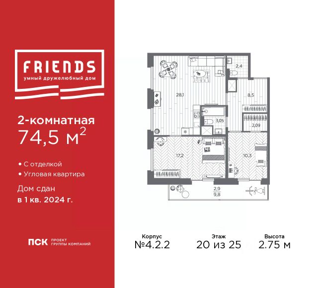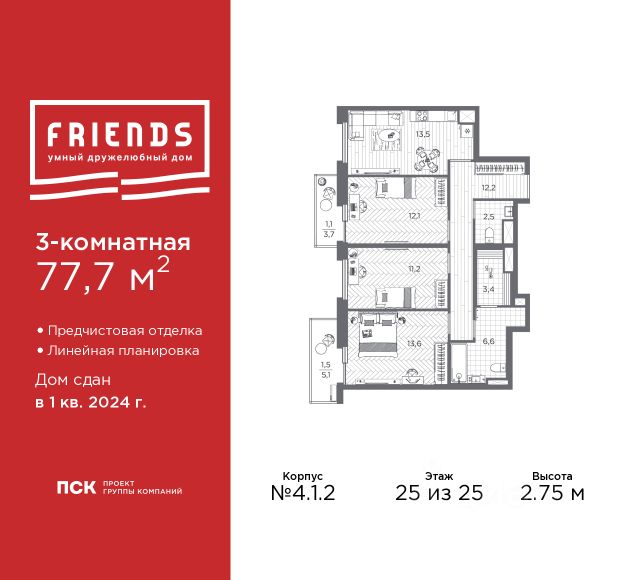 Продается 3-комн. квартира с предчистовой отделкой в ЖК "Friends" на 25 этаже. Общая площадь: 77.7 кв.м., жилая: 36.8 кв.м., площадь просторной кухни-столовой: 13.5 кв.м. Комнаты изолированные, все окна выходят на одну сторону. В квартире два балкона, один совмещенный и один раздельный санузел. Высота потолков 2.75 м. Эта квартира представлена в предчистовой отделке. В ЖК Friends есть квартиры без отделки, квартиры с предчистовой отделкой (White Box) и с чистовой отделкой в двух вариантах: светлая и тёмная. Квартира находится в корпусе 4.1.2. Дом монолитный, одноподъездный, высотой 25 этажей. На этаже 9 квартир. В подъезде 2 пассажирских и 1 грузовой лифт. В настоящее время строительство окончено, дом сдан в 1 квартале 2024 года. Оформление сделки по договору купли-продажи. На оставшиеся квартиры "Семейная ипотека" не распространяется. FRIENDS новый жилой комплекс комфорт-класса в Приморском районе рядом с Новоорловским заказником и Суздальскими озерами. Из квартир открываются живописные виды. Протяженность границы зеленой зоны в этой части более 1,3 км, вдоль нее протекает река Каменка, а также в шаговой доступности находятся несколько озёр. ЖК FRIENDS отделен от жилой застройки территорией школьного стадиона и спортивными площадками. 100 150 метров до школы 632 и двух детских садов. Двор ЖК Friends — полноценная территория для активного или спокойного отдыха. Детские игровые зоны и площадки для отдыха взрослых, зоны для катания на роликах и две площадки для воркаута. Предусмотрены велопарковки у парадных. Социальная инфраструктура: школа, ДС, магазины, рядом крупные ТЦ, гипермаркеты, спортивные клубы. - Умные планировки - вы можете сделать функциональным каждый метр. - Многоуровневый 7 этажный паркинг - IP домофония с установкой конечного устройства (панели) в квартире. Видеонаблюдение на придомовой территории с возможностью трансляции на домофон/приложение. Современный СКУД - Дистанционный сбор показаний счетчиков (вода, тепло, электричество) - Горизонтальная разводка отопления - Места для установки кондиционеров на балконах. ЖК находится в 15 минутах на транспорте от станции метро "Проспект Просвещения", "Озерки" и "Парнас". Выезд из микрорайона на Суздальское шоссе 2 минуты на транспорте или пешком 5 10 минут. Варианты оплаты: - Ипотека: ГК "ПСК" аккредитован ведущими банками. - Рассрочка от застройщика на выгодных условиях. - Материнский капитал - Trade-in в зачет старой недвижимости. Надежный застройщик ГК "ПСК". Все объекты сдает в срок. Рейтинг на ЕРЗ максимальный 5 баллов. Аккредитация в банках: ПАО Банк "ВТБ", "Сбербанк России", АО "ДОМ.РФ", ПАО АКБ "Металлинвестбанк", ПАО "Совкомбанк". #2w527S