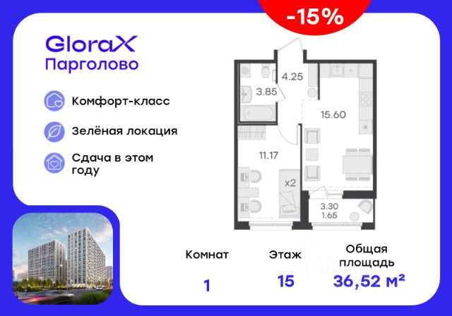 Продается квартира-студия на 3-м этаже в проекте комфорт-класса GloraX Парголово. Общая площадь лота составляет 29,02 кв. м, из которых 19,75 кв. м отведено под жилую и кв. м под кухонную зону. Номер квартиры - 154. Преимущества: - Квартира комфорт-класса с полной чистовой отделкой - Зеленый район, Шуваловский парк в 20 мин. пешком - 10 мин. до КАД, 15 мин. до ЗСД - 5 эт. паркинг на 451 м/м - Закрытые дворы с видеонаблюдением - Детские площадки с геопласткой и бизиборадми - Сады и школы в шаговой доступности - Спортивные площадки и велодорожки - Собственный комьюнити-центр - Келлеры для хранения - Коммерческие помещения на 1 этажах GloraX Парголово — масштабный проект комфорт-класса в Выборгском районе Санкт-Петербурга. Место, продуманное до мелочей, где все, что необходимо — рядом. Архитектурно-пространственное решение отличается лаконичностью и строгостью и придает проекту свой характер. Внутренние дворы закрыты от внешнего мира, создавая приватную территорию для жителей. Живите на природе, но с комфортом мегаполиса. Десять минут на велосипеде или полчаса пешком — и вы окажетесь в одном из культовых мест отдыха петербуржцев: Шуваловском парке, Орловском заказнике с их чистыми карьерами или на Суздальских озерах. До ж/д станции "Парголово" 7 минут на автомобиле, до метро Проспект Просвещения 25 минут, КАД 10 минут, ЗСД 15 минут. В шаговой доступности остановка общественного транспорта. В шаговой доступности — собственные школы и детские сады. Здесь все создано для максимального комфорта каждого жителя. Приватное пространство внутреннего двора с беседками с розетками для работы и отдыха, зеленый двор с уютным многоуровневым освещением, детскими эко-площадками и спортивными workout создает неповторимую атмосферу, заряжающую энергией на новые свершения. Квартиры сдаются с предчистовой отделкой White box, с возможностью дозаказа отделки в двух цветовых вариантах. Цена указана при 100% оплате или стандартной ипотеке. Узнайте подробности в Отделе продаж.