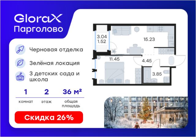 Продается 1-комн. квартира на 7-м этаже в проекте комфорт-класса GloraX Парголово. Общая площадь лота составляет 37,53 кв. м, из которых 10,82 кв. м отведено под жилую и 14,62 кв. м под кухонную зону. Номер квартиры - 196. Преимущества: - Квартира комфорт-класса - Зеленый район, Шуваловский парк в 20 мин. пешком - 10 мин. до КАД, 15 мин. до ЗСД - 5 эт. паркинг на 451 м/м - Закрытые дворы с видеонаблюдением - Детские площадки с геопласткой и бизиборадми - Сады и школы в шаговой доступности - Спортивные площадки и велодорожки - Собственный комьюнити-центр - Келлеры для хранения - Коммерческие помещения на 1 этажах GloraX Парголово — масштабный проект комфорт-класса в Выборгском районе Санкт-Петербурга. Место, продуманное до мелочей, где все, что необходимо — рядом. Архитектурно-пространственное решение отличается лаконичностью и строгостью и придает проекту свой характер. Внутренние дворы закрыты от внешнего мира, создавая приватную территорию для жителей. Живите на природе, но с комфортом мегаполиса. Десять минут на велосипеде или полчаса пешком — и вы окажетесь в одном из культовых мест отдыха петербуржцев: Шуваловском парке, Орловском заказнике с их чистыми карьерами или на Суздальских озерах. До ж/д станции "Парголово" 7 минут на автомобиле, до метро Проспект Просвещения 25 минут, КАД 10 минут, ЗСД 15 минут. В шаговой доступности остановка общественного транспорта. В шаговой доступности — собственные школы и детские сады. Здесь все создано для максимального комфорта каждого жителя. Приватное пространство внутреннего двора с беседками с розетками для работы и отдыха, зеленый двор с уютным многоуровневым освещением, детскими эко-площадками и спортивными workout создает неповторимую атмосферу, заряжающую энергией на новые свершения. Квартиры сдаются без отделки. Цена указана при 100% оплате или стандартной ипотеке. Узнайте подробности в Отделе продаж.