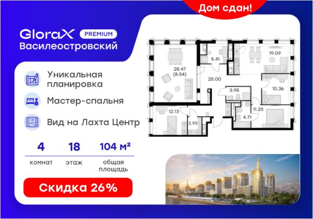 Продается 4-комн. квартира на 11-м этаже в сданном проекте премиум-класса GloraX Premium Василеостровский. Общая площадь лота составляет 101,80 кв. м, из которых 45,94 кв. м отведено под жилую и 32,99 кв. м под кухонную зону. Номер квартиры - 36 Преимущества квартиры: • Эта квартира — редкое сочетание продуманного пространства и вдохновляющих панорам. Её уникальная планировка раскрывает максимум света и воздуха, а из каждого окна — завораживающий вид на залив и Лахта Центр, который особенно волшебен в вечерних огнях. • Просторная мастер-спальня с собственной ванной создаёт атмосферу уединённой роскоши, где каждый день начинается и завершается в абсолютном комфорте. Наличие двух санузлов обеспечивает удобство для всей семьи и гостей, подчёркивая высокий уровень современного жилья. • Особая гордость — видовая лоджия, идеальное место для утреннего кофе, вечерних размышлений или встреч с близкими под открытым небом с панорамой на водную гладь и небоскрёбы. • Это не просто квартира — это образ жизни, наполненный светом, простором и видами, достойными открытки. GloraX Premium Василеостровский это роскошный видовой комплекс премиум-класса на первой береговой линии Финского залива. Проект уникален по своему опциональному наполнению: вся необходимая для комфортной городской жизни инфраструктура будет в составе самого комплекса. Здесь откроется фитнес-клуб класса премиум, кинотеатр только для резидентов, летом будет работать общая видовая терраса на крыше, откуда откроются потрясающие виды на воду. В GloraX Premium Василеостровский расположится гастрономический кластер - ресторанная улица с видом на Финский залив. В пяти минутах пешком от проекта GloraX строит образовательный кластер. В состав кластера войдет общеобразовательная школа с развивающими пространствами, футбольным полем, большим спортивным стадионом и 2 -мя плавательными бассейнами. Во втором корпусе проекта откроется детский сад с собственной территорией для прогулок. Транспортную доступность обеспечивает близость к ЗСД. Дорога до Дворцовой площади займет 25 минут на автомобиле. Ближайшая остановка общественного транспорта находится в 1 минуте пешком от комплекса. Все квартиры передаются с отделкой White Box. Цена указана при 100% оплате или стандартной ипотеке. Узнайте подробности в Отделе про