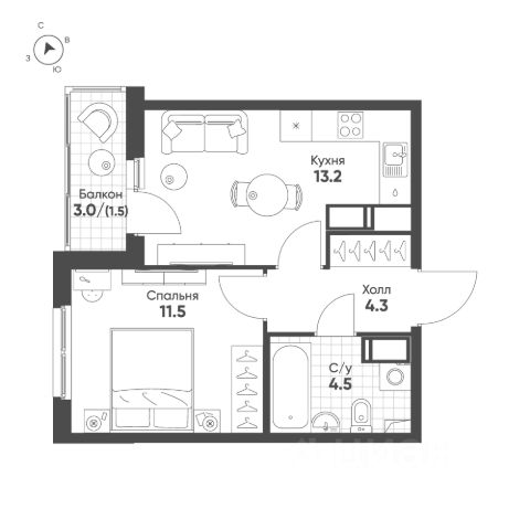 Продается квартира 517, по адресу г. Санкт-Петербург, поселок Шушары, Школьная улица, корпус Клюква.Парк, 3 очередь в Клюква.Парк на 11 этаже, с площадью 48.5 м2.