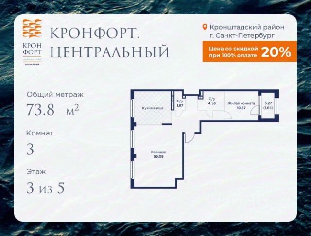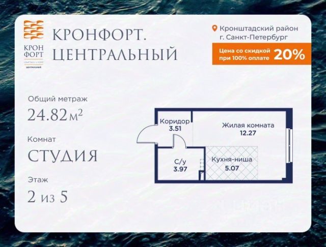 Стоимость квартиры указана со скидкой 20%. Скидка предоставляется при 100% оплате или несубсидированной ипотеке. Предлагается квартира площадью 40.69 кв.м в жилом комплексе "Кронфорт. Центральный" в Санкт-Петербурге (Кронштадт). Возможна покупка с использованием льготных и специальных ипотечных программ с государственной поддержкой. Высота потолков в квартирах — от 3 до 3,4 метров, окна увеличенного размера, есть варианты с эркерами, французскими балконами, лоджиями и террасами. Жилой квартал состоит из пяти четырехэтажных корпусов с закрытыми охраняемыми дворами, свободными от машин. Первые этажи формируют торговые променады в стиле пешеходных улиц исторической части Петербурга и Кронштадта. Внутренние пространства между корпусами — пешеходные зоны с уютными площадями. Архитектурный облик квартала разработан бюро "Проектная культура" и международной компанией Chapman Taylor. Инфраструктура комплекса включает: - Лицей с двумя бассейнами - Детский сад на 150 мест с бассейном и закрытой территорией - Веревочный парк - Игровые площадки для активного отдыха; - Кабинет врача общей практики. - Подземные паркинги с лифтами. - Мусоросборные камеры, индивидуальные кладовые. - Закрытые дворы с контролем доступа и видеонаблюдением. - Мультформатный стрит-ретейл с кафе и ресторанами. - Триатлон-центр и беговые/велодорожки. - Учебно-тренировочный комплекс для детей "Лагерь настоящих героев". Транспортная доступность обеспечивает удобный выезд на КАД (около 1-3 км), 2 минуты пешком до автобусной остановки "Лицей", 25 минут до Сестрорецка, 30 минут до "Лахта-центра", 50 минут до аэропорта "Пулково" и 60 минут до Московского вокзала. Для любителей моря доступен маршрут на "Метеоре" до центра Санкт-Петербурга. Отделка квартир предлагается как с готовой чистовой отделкой, так и со свободной планировкой без отделки для реализации индивидуальных дизайнерских решений. В третьем корпусе, продажи которого стартовали в марте 2025 года, доступны квартиры с просторными террасами, тремя балконами, кухнями-гостиными до 38 кв.м с окнами на две стороны, обеспечивающими панорамное освещение и виды. Если вам нужна помощь с оформлением ипотеки или дополнительная информация по комплексу и условиям покупки, обращайтесь в отдел продаж за консультацией.