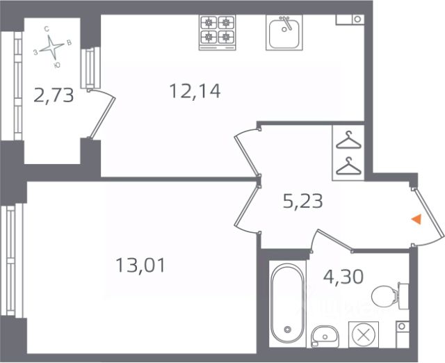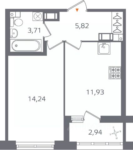 Планировка отличается продуманностью: просторная кухня площадью 14,4 м², изолированная комната 12,39 м², компактный санузел (3,94 м²) и удобная прихожая (4,69 м²). Балкон (2,89 м²) добавляет полезное пространство, а общая площадь с учетом лоджии составляет 38,31 м².