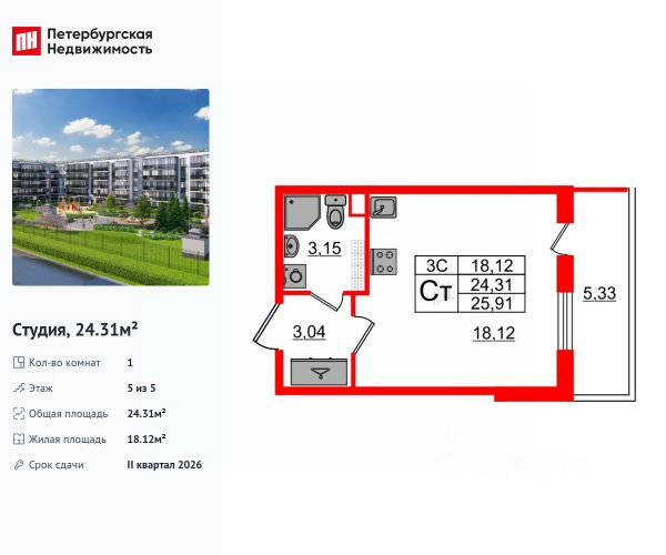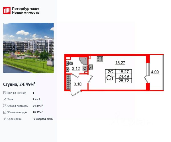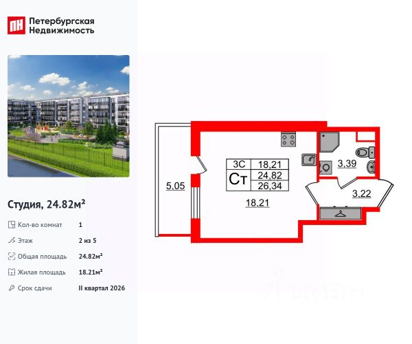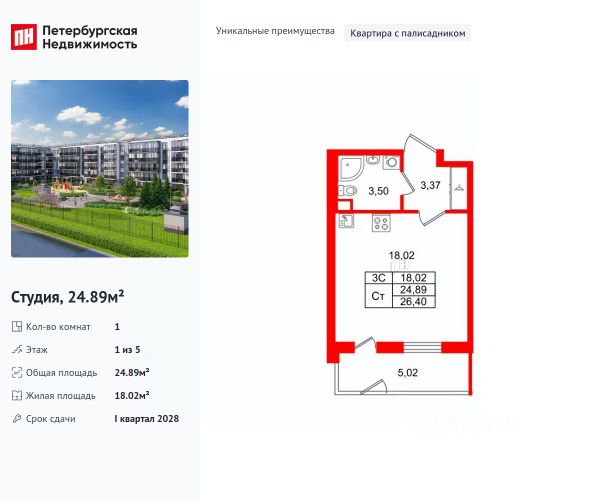Продается просторная студия от застройщика в жилом комплексе "Парадный ансамбль" в престижном Московском районе. До метро можно добраться на транспорте всего за 20 минут. Удобная, классическая, функциональная европланировка, просторная прихожая 3.5 м². Общая площадь студии - 25.09 м², жилая 18.2 м², высота потолка 2.77 м. Квартира продается с отделкой "Норд Лайн светлый". Что особенного в ЖК "Парадный ансамбль"? • Инновационный Лицей Setl с оригинальной архитектурной концепцией и уникальной образовательной средой • Масштабное малоэтажное строительство в престижном Московском районе • Рекреационные зоны: парадный парк в центре квартала, ручей с собственной набережной, центральная площадь, ресторанный комплекс и пешеходный бульвар • Фасады из керамогранита и кирпича с яркими и акцентными входными группами • Две самые большие площадки Setl Kids и Setl Sport • Уникальные квартиры.High Flat на последних этажах, палисадники у квартир на первом этаже, семейные секции, квартиры с саунами и окном в ванной