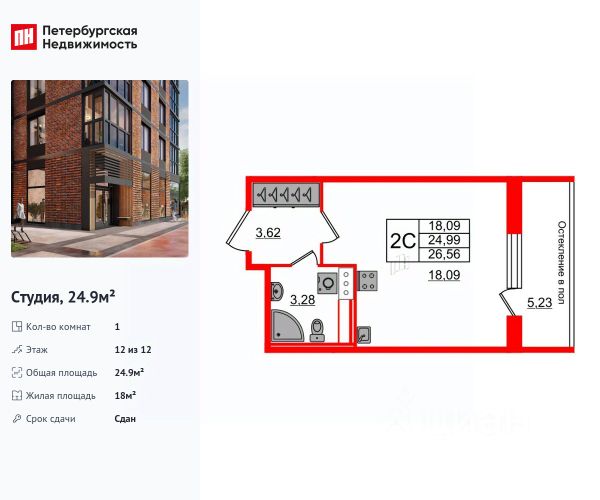 Общая плoщадь кваpтиры - 28,15 кв.м., куда входит: