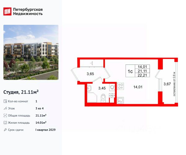 Продается уютная студия от застройщика в жилом комплексе "Универ Сити" в на юге Санкт-Петербурга. До метро можно добраться на транспорте всего за 30 минут. Удобная, классическая, функциональная европланировка, просторная прихожая 3.65 м². Общая площадь студии - 21.28 м², жилая 14.01 м², высота потолка 2.77 м. Квартира продается с отделкой "Норд Лайн светлый". Что особенного в ЖК "Универ Сити"? • Малоэтажное строительство • Скандинавские фасады с отделкой керамогранитом, акцентные входные группы • Закрытые внутренние дворы без машин • Пешеходный променад с тематическими зонами, еловый сквер и яблоневый сад • Инновационный Лицей Setl с оригинальной архитектурной концепцией и уникальной образовательной средой • Универ Парк, включая SetlSport и SetlKids, площадку для выгула собак и зоны отдыха