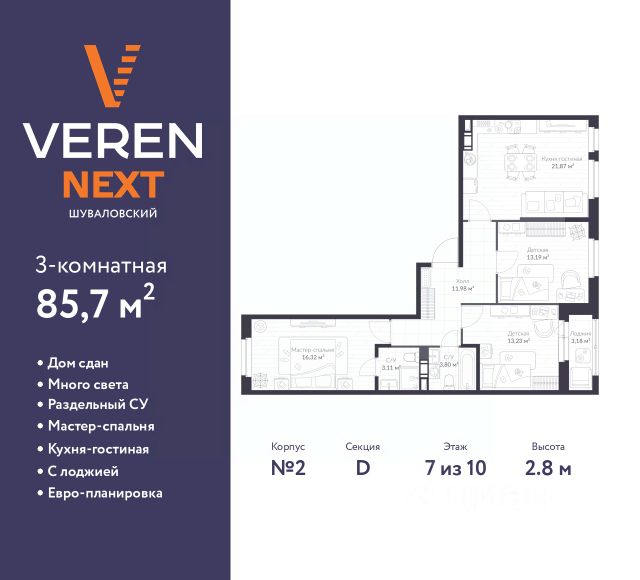Спешите забронировать на этих условиях! Предложение ограничено! Стоимость квартиры указана со скидкой, ваша экономия составит 3,441,176 RUB. Информация по телефону, мы вам все подробно расскажем! Трехкомнатная квартира в ЖК "VEREN NEXT Шуваловский" на 2 этаже. Квартира без отделки, после оформления собственности можно делать ремонт. Общая площадь: 83.3 кв.м., жилая: 41.72 кв.м., площадь просторной куxни-гостиной: 22.17 кв.м. Квартира - распашонка, без проходных комнат, окна выходят на paзные стороны дома. В квартире два совмещенных санузла. Высота потолков 2.8 м. Квартира будет сдана без отделки. Установлены стеклопакеты с повышенной тепло- и шумоизоляцией, установлены элементы отопления, входная дверь, заведены все коммуникации. Вы сможете реализовать свои самые смелые планы дизайн-проекта. Дом монолитный, двухподъездный, высотой 10 этажей. Квартира находится во 2-й секции в корпусе 2. В подъезде 1 грузовой лифт. Начало строительства - 4 квартал 2019 года. Строительство окончено, дом сдан в 3 квартале 2023 года. Оформление сделки по договору купли-продажи. Евро-планировка, для большой семьи, куxня-гостиная, раздельный су, мастер-спальня, вид на приватный двор. ЖК "VEREN NEXT шуваловский" - жилой комплекс комфорткласса, расположенный в Приморском районе Санкт-Петербурга. Дома с выразительной авторской архитектурой от именитого бюро "Студия 44". Смело сочетая материалы и формы, архитекторы разработали эффектный и запоминающийся проект, который разительно отличается от представленных в окружении. Отделка фасадов отдаёт дань одновременно и традициям, и трендам. На каждом этаже находится не более 7 квартир. Наши специалисты разработали 47 различных типов планировочных решений, каждое из которых продумано с учетом требований эргономики и функциональности, где нет бесполезной площади. Общее для всех вариантов — увеличенные оконные проемы, а во многих комнатах сразу по два окна, что обеспечивает естественное освещение и ощущение простора. На верхних этажах располагаются квартиры с панорамным остеклением. Ещё больше света и панорамных видов — для тех, кто ценит красоту каждого дня! Красивые парадные с витражным остеклением созданы по индивидуальному дизайн-проекту. В приватном благоустроенном дворе VEREN NEXT Шуваловский найдется место и для детских игр, и для спортивных тренировок на свежем воздухе, и для спокойного отдыха. Пространство здесь спланировано так, чтобы взрослые и малыши проводили время с комфортом. На территории комплекса предусмотрен собственный детский сад. Этот дом красив снаружи и комфортен изнутри. Правильное благоустройство и зонирование позволят каждому жильцу дома комфортно проводить свой досуг. Доступ на территорию комплекса закрыт, а пропускная система позволяет почувствовать себя дома ещё до того, как вы поднимитесь в квартиру. Здесь есть всё, чтобы сэкономить время: магазины, кафе, разнообразные бытовые услуги, подземный паркинг, колясочные и кладовые. ЖК "VEREN NEXT шуваловский" расположен в одной