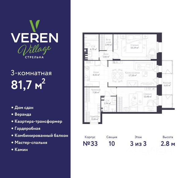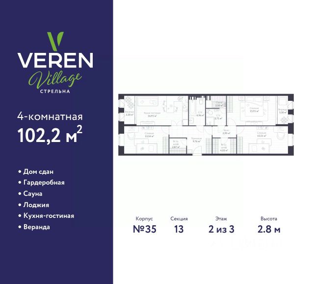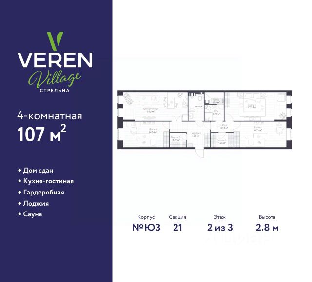 Успейте забронировать, пока действует скидка! Срок предложения ограничен! Стоимость квартиры указана со скидкой, ваша экономия составит 2,683,800 RUB. Звоните, мы вам все подробно расскажем! Просторная трехкомнатная квартира в ЖК "VEREN VILLAGE Стрельна" на 3 этаже. Квартира без отделки, новый владелец может сделать ремонт по индивидуальному проекту. Общая площадь: 99.4 кв.м., жилая: 39.25 кв.м., площадь просторной куxни-гостиной: 32.17 кв.м. Квартира угловая, очень светлая, естественная вентиляция при открытии окон. В квартире два балкона, два совмещенных санузла. Высота потолков 2.8 м. Дом монолитный, двухподъездный, высотой 3 этажа. Квартира находится в 1-й секции в корпусе Южный 1. В подъезде 1 грузовой лифт. На сегодняшний день строительство окончено, дом сдан во 2 квартале 2022 года. Оформление сделки по договору купли-продажи. Веранда, куxня-гостиная, камин, сауна, мастер-спальня. VEREN VILLAGE Стрельна - малоэтажный жилой комплекс бизнес-класса, расположенный в престижном Петродворцовом районе Санкт-Петербурга. Рядом с комплексом находится Константиновский дворец (всего 800 метров), до Финского залива - 1,5 км. Исторической окружение, чистый воздух уютного зеленого района, озеро с благоустроенной набережной на закрытой территории комплекса, собственный спортивно-оздоровительный комплекс с плавательным бассейном - все это делает жизнь в VEREN VILLAGE спокойной и уютной, максимально приближенной к загородной. А до КАД можно добраться за 5 минут. Все дома на территории - трехэтажные, во дворе каждого из них высажены деревья разных пород, в каждом дворе своя. Трёхэтажные дома VEREN VILLAGE стрельна не закрывают от вас солнце и звёзды. Вдоль главной дороги комплекса - светлая сосновая аллея. Центральная площадь выходит на озеро, вдоль которого оборудована прогулочная набережная с велосипедными дорожками. Для отдыха устроены рыбацкий мостик и деревянная палуба-пляж - личный курорт для жителей VEREN VILLAGE стрельна. На каждом этаже находится не более 6 квартир. Архитектурный облик комплекса, разработанный знаменитым бюро "Остоженка" заслуживает особого внимания. При отделке фасадов домов применяется долговечный и эффектный кирпич ручной формовки. Все стильные парадные исполнены по авторскому дизайн-проекту с использованием натуральных материалов. Несмотря на малоэтажность, в парадных предусмотрены лифты. Ландшафтный дизайн разделил все пространство комплекса на тихие прогулочные зоны и места для активного отдыха. Вся территория VEREN VILLAGE закрыта и охраняется. Для автомобилей жильцов предусмотрен подземный паркинг. Аккредитация в банках: ПАО Банк "ВТБ", "Сбербанк России", ОАО "Альфа-Банк", ПАО "Газпромбанк", АО "Райффайзенбанк" и других. #24cdS8 Купить квартиру в ЖК Veren Village Стрельна в Санкт-Петербурге.