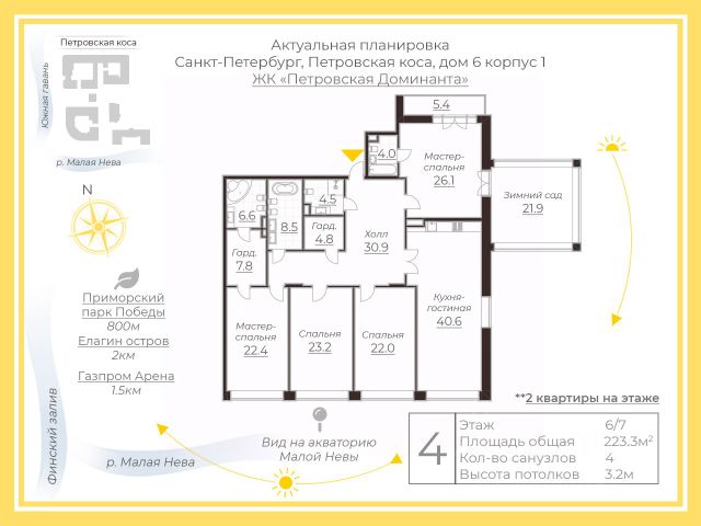 Апартамент 787 в Комплексе "17/33 Петровский остров" О проекте: Пространство 17/33 RESIDENCE открывает двери в мир роскошной жизни, изысканной архитектуры, пятизвездочного сервиса и безграничных привилегий. Помимо уникальных планировок и эксклюзивных форматов апартаментов, будущих резидентов ждет премиальный сервис и авторская инфраструктура — гранд-лобби и музыкальная гостиная, детский клуб и просторный home office, зал для семейных праздников и зимний сад для медитаций. Уникальная локация. Проект расположен в объятьях главных островов Петербурга — Петроградской стороны, Васильевского и Крестовского, и в самой зеленой и выигрышной части Петровского — на первой линии Малой Невы, между величественной рекой и тихим Петровским прудом. До ключевых точек притяжения, любимых парков, шопинга и развлечений — пара минут на авто. 100% видовых апартаментов. Виды на Малую Невку, на Петровский пруд.; 5-8 этажей; высота потолка до 7 метров; 1000 м2 общественных пространств; фитнес и СПА; кинозал и зал для семейных торжеств; коворкинг и детский клуб; лаундж с библиотекой; терраса площадью 120 м2 для резидентов; ELEMENT создает премиальные проекты в сфере недвижимости Санкт-Петербурга — с уникальными концепциями, продуманным наполнением и сервисом самого высокого уровня. Продаю квартиру с зимним садом в Санкт-Петербурге.