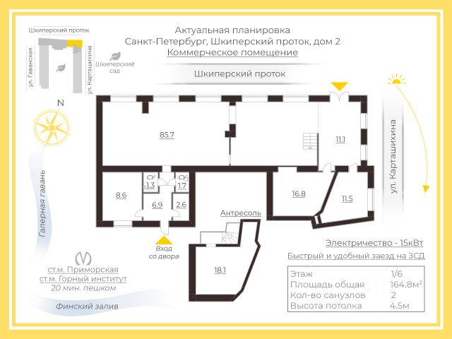 Арт. 95068699 Предлагается к продаже коммерческое помещение в добротном Сталинском доме 1939 года постройки(железобетонные перекрытия). Дом прошел ремонт фасада 2024 году, так же были заменены все инженерные сети в доме по программе капремонта. Помещение имеет два входа с улицы и со двора, большие витринные окна и высокие потолки 4,5 метра. Площадь помещения 164,8 м2, включает площадь антресоли 18,1м2. Электричество 15кВт Есть возможность установить кондиционер и протечную вентиляцию. Помещение отвечает всем современным требованиям и отлично подойдет для магазина, шоурума, стоматологической клиники, салона красоты и т.д. В собственности физического лица.