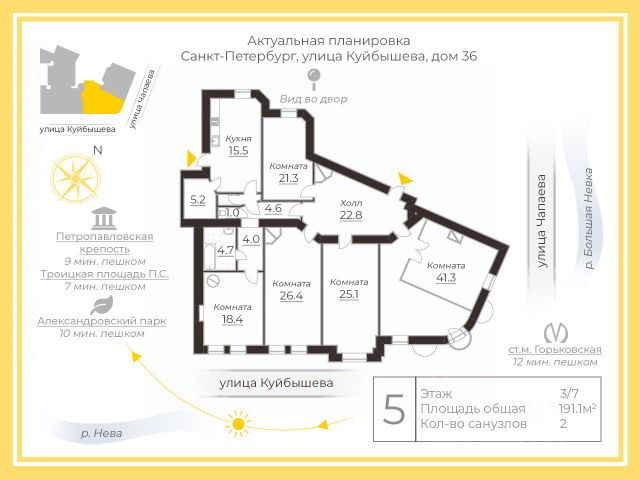 Арт. 131918929 Предлагаем к продаже 6-ти комнатную квартиру общей площадью 192 кв.м. в историческом центре Санкт-Петербурга, в самом сердце Петроградского района. Легким прогулочным шагом за 9 минут вы оказываетесь у Петропавловской крепости, в 10 минутах Александровский парк, а буквально через улицу Петроградская набережная, где монументально застыла Аврора! Дом имеет статус памятника архитектуры. В 2020 году проведен капитальный ремонт всех инженерных систем, коммуникаций, лифтового оборудования, крыши, подвальных помещений и фундамента. Перекрытия смешанные, материал стен кирпич. Построен по индивидуальному проекту в 1913 году. В квартире расположены 2 камина, в больших комнатах по 2 окна, что дает возможность разделить их при желании и задумке дизайнера. Главная особенность квартиры - французский балкон с которого открывается вид на Петроградскую набережную. В доме 2 лестницы: парадная и черная ( в хорошем состоянии). Высота потолков 4 метра! Квартира подойдет, как для истинного ценителя имперских домов с высокими потолками, огромными комнатами, так и для предпринимателей, которые задумают отремонтировать и сдавать посуточно, учитывая, что Санкт-Петербург туристическая мекка, вложения оправдают себя со сторицей! Прямая продажа! Один собственник! Документы готовы! Ждем на просмотр! Предлагаем ПРЕМИАЛЬНОЕ обслуживание для требовательных клиентов. Оперативно организуем просмотр, предоставим полную информацию по объекту. 20 лет работы с требовательными клиентами подготовили нас к решению ВАШИХ сложных задач. Будем рады знакомству! Ул. Рубинштейна, д.8.