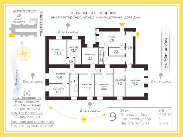 Предлагаем вашему вниманию просторную квартиру в историческом центре Санкт-Петербурга. Этот уникальный объект расположен на Пушкинской улице, всего в 4 минутах пешком от метро "Площадь Восстания" или "Маяковская". Квартира занимает 160 квадратных метров на последнем, пятом этаже кирпичного дома 1877 года постройки. ЛИФТА нет! Высокие потолки в 3.2 метра создают ощущение простора и света. В квартире шесть комнат, что позволяет комфортно разместиться большой семье или использовать пространство для различных нужд. Кухня площадью 12 квадратных метров станет отличным местом для семейных ужинов. Из окон открывается вид как на тихую улицу, так и во двор. Для вашего удобства предусмотрены один совмещенный и один отдельный санузел. Имеется прачечная. Дом, в котором находится квартира, отличается прочностью и долговечностью благодаря кирпичной постройке. Придомовая территория оборудована наземной парковкой, поэтому можно не беспокоиться о месте для машины. Район, где расположена квартира, предлагает развитую инфраструктуру. Поблизости находятся школы, детские сады и клиники, что особенно удобно для семей с детьми. В шаговой доступности — разнообразные магазины, обеспечивающие все необходимые покупки. Условия сделки: квартира продается без обременений, ипотека возможна. Все документы готовы к сделке, что позволяет быстро оформить покупку. Приглашаем вас на просмотр этой замечательной квартиры! Записывайтесь на удобное время и оцените все её преимущества лично.