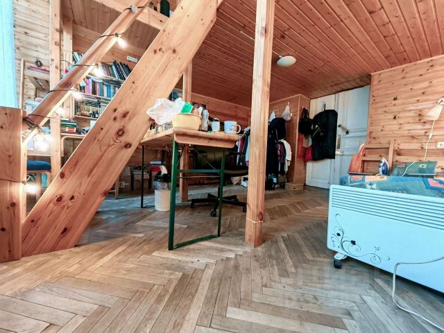- Комната имеет форму практически идеального квадрата. Благодаря высокому потолку оборудован второй уровень. На первом уровне гостиная, на втором-спальная зона. Комната светлая благодаря двум окнам. Обшита деревом. Имеется встроенная система хранения.