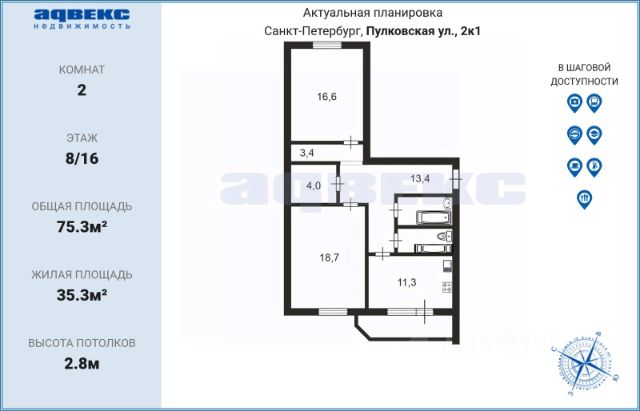 ID: 1915356 Продаётся просторная двусторонняя двухкомнатная квартира в кирпичном доме Основные характеристики: Квартира площадью 75,3 кв.м. плюс балкон 4,9 кв.м. состоит из двух комнат, расположенных друг на против друга, кухни 11,3 кв.м., в которой легко поместиться кухонный гарнитур, бытовая техника и обеденный стол, раздельного вместительного санузла и большой кладовой, отлично подходящей под гардеробную или кабинет. Квартира продается без отделки, что позволяет сделать ремонт под себя, не тратя время и деньги на удаление отделочных материалов и вынос строительного мусора. Внутри квартиры нет несущих конструкций, что дает возможность скорректировать планировку под потребности покупателя. Квартира располагается на 8 этаже кирпичного дома 2009 года постройки. Кирпичные дома отличаются долговечностью и толстыми стенами, защищающими помещение от шума с улицы и от соседей, а также сохраняющими тепло зимой. Чистая, недавно отремонтированная, парадная, грузовой и пассажирский лифт, четыре квартиры на этаже. Развитая инфраструктура района: в шаговой доступности есть супермаркеты, школа, салоны красоты, банки, торговый центр, медицинские учреждения и еще много различных организаций. Транспортная доступность: до пулковского шоссе - 10 минут на машине до въезда на КАД - 10 минут на машине до метро "Звездная" - 12 пешком ; Условия продажи: 1 взрослый собственник владеет более 5 лет; прямая продажа; никто не зарегистрирован; материнский капитал при покупке не использовался; без обременений, перепланировок, долгов по коммунальным услугам; документы готовы к сделке; возможна ипотека. Приглашаем на просмотр! Договоримся о удобном для вас времени.
