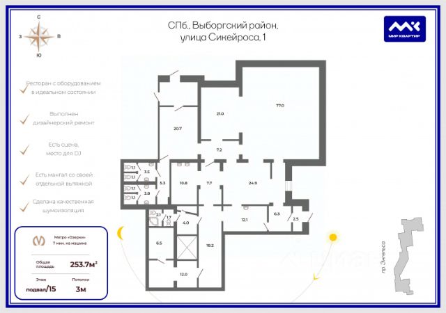 Арт. 123270629 Редкое предложение на рынке Санкт-Петербурга! Ресторан с оборудованием в идеальном состоянии! Предлагается коммерческое помещение 253.7 м.кв. В выборгском районе, на улице Сикейроса. В жилом доме комфорт класса. В обжитом, хорошо развитом районе. Ресторан расположен в подвальном помещении. Сделана качественная шумоизоляция. На первом этаже коммерческие помещения. В ресторане выполнен дизайнерский ремонт! Все предметы интерьера и обстановки внутри исключительного качества. Есть сцена, место для DJ, свет и звук профессиональный. Уникальная свечная вытяжка проходящая через весь дом, что в настоящее время редкость. Бар со всем необходимым оборудованием. Есть мангал!! со своей отдельной вытяжкой! Полностью оборудованная кухня! Все в хорошем рабочем состоянии. Есть кабинеты для персонала и руководителя. Гримерки. Гардероб. Второй выход на паркинг. Есть своя низкотемпературная камера. Место под разгрузку со двора. Метро Озерки в 7-10 минут пешком!! Предлагаем ПРЕМИАЛЬНОЕ обслуживание для требовательных клиентов. Оперативно организуем просмотр, предоставим полную информацию по объекту. 20 лет работы с требовательными клиентами подготовили нас к решению ВАШИХ сложных задач. Будем рады знакомству! Ул. Рубинштейна, д.8.