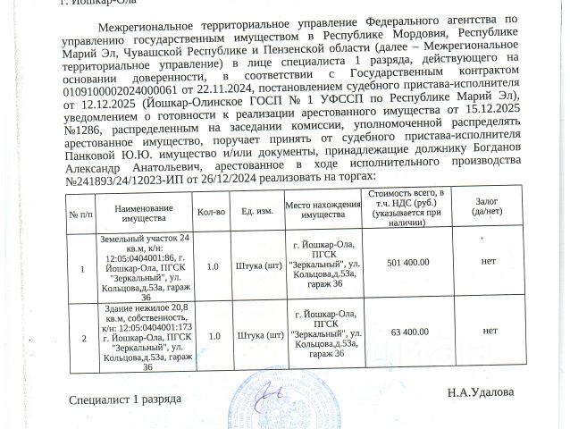 Данные получены с сайта ГИС Торги. Земельный участок 24 кв.м, к/н: 12:05:0404001:86; Здание нежилое 20,8 кв.м, к/н: 12:05:0404001:173, расположенные по адресу: г. Йошкар-Ола, ул. Кольцова,д.53а ПГСК "Зеркальный", гараж 36, принадлежащие должнику Богданову А.А