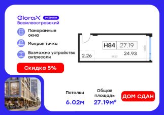 Продается офисное помещение свободного назначения - 27,19 кв.м. в премиальном проекте GloraX Premium Василеостровский.