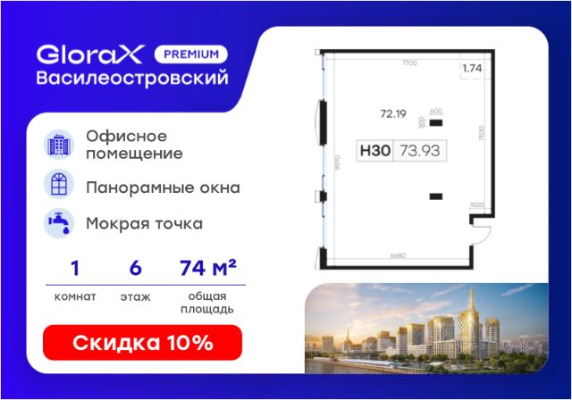 Продается офисное помещение - 73,93 кв.м. в премиальном проекте GloraX Premium Василеостровский.