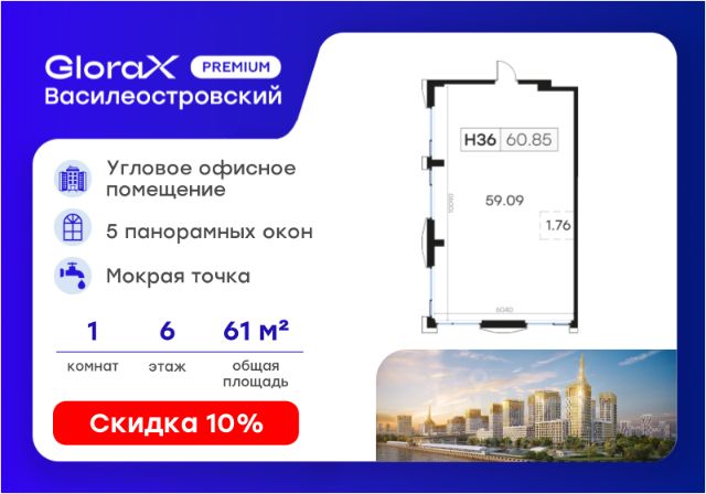 Продается офисное помещение - 60,85 кв.м. в премиальном проекте GloraX Premium Василеостровский.