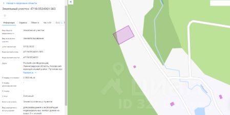 Площадью 2000 кв.м., кадастровый номер 47:16:0524001:383, разрешенное использование: для размещения и эксплуатации индивидуальных жилых домов не выше 3-х этажей.