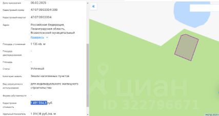 площадью 900 кв.м., кадастровый номер 47:16:0601001:909, разрешенное использование: для индивидуального жилищного строительства.
