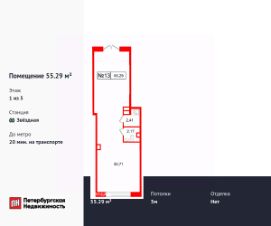 Продается помещение в ЖК Парадный ансамбль площадью 55.29 м2. Помещение расположено рядом с метро Московская. Расстояние до метро 20 Мин.на транспорте. Корпус сдается в 2028. Высота потолка 3 м. Без отделки.