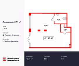 Продается помещение в ЖК ЖК "Дворцовый фасад площадью 42.35 м2. Помещение расположено рядом с метро Проспект Ветеранов. Расстояние до метро 25 Мин.на транспорте. Корпус сдается в 2026. Высота потолка 3.6 м. Без отделки.