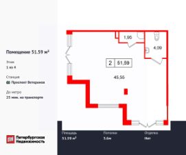 Продается помещение в ЖК ЖК "Дворцовый фасад площадью 51.59 м2. Помещение расположено рядом с метро Проспект Ветеранов. Расстояние до метро 25 Мин.на транспорте. Корпус сдается в 2026. Высота потолка 3.6 м. Без отделки.