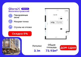 Продается офисное помещение свободного назначения - 73, 93 кв.м. в премиальном проекте GloraX Premium Василеостровский.
