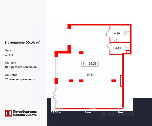 Продается помещение в ЖК ЖК "Дворцовый фасад площадью 65.36 м2. Помещение расположено рядом с метро Проспект Ветеранов. Расстояние до метро 25 Мин.на транспорте. Корпус сдается в 2026. Высота потолка 3.6 м. Без отделки.
