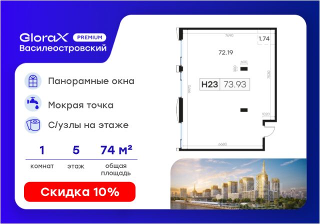 Продается офисное помещение - 73, кв.м. в премиальном проекте GloraX Premium Василеостровский. Помещение расположено на 1 линии улицы с динамично растущим автомобильным и пешеходным трафиком. Хорошо просматривается с прилегающей территории. Ликвидная площадь о...