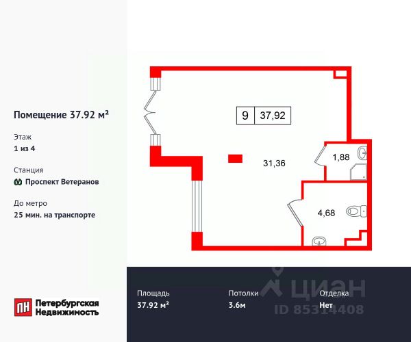 Продается помещение в ЖК ЖК "Дворцовый фасад площадью 37.88 м2. Помещение расположено рядом с метро Проспект Ветеранов. Расстояние до метро 25 Мин.на транспорте. Корпус сдается в 2026. Высота потолка 3.6 м. Без отделки.