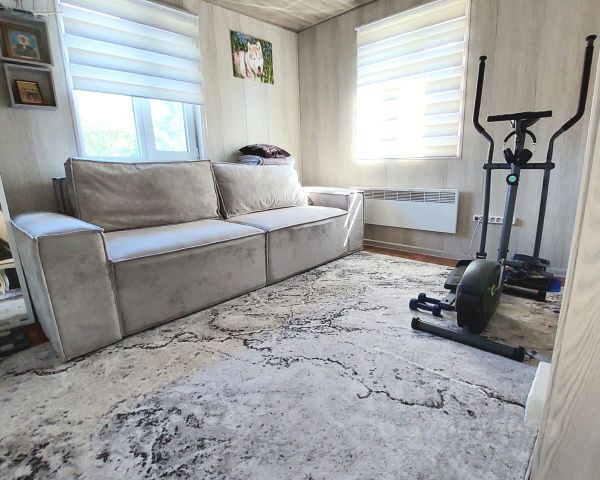 Полностью жилой, с отделкой и мебелью. В цоколе — две автономные спальни с санузлами, комната отдыха и котельная. Первый этаж: крытый гараж на два авто, помещение охраны, диспетчерская, кухня, столовая, зона отдыха, две спальни и два санузла. Второй этаж: кухня-столовая, две спальни и два санузла.