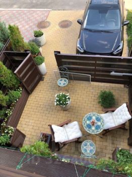 Таунхаус расположен на угловом участке площадью 2,6 сотки. Можно выполнить просторную террасу с зоной барбекю. На участке сделана парковка из брусчатки на 2 автомобиля. Окна смотрят на солнечную юго-западную сторону. Открываются отличные виды на лес и расположенные ниже дома. Вид разрешенного использования - ИЖС.