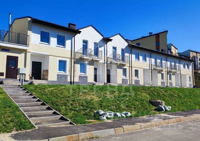 Таунхаус расположен на угловом участке площадью 2,6 сотки. Можно выполнить просторную террасу с зоной барбекю. На участке сделана парковка из брусчатки на 2 автомобиля. Окна смотрят на солнечную юго-западную сторону. Открываются отличные виды на лес и расположенные ниже дома. Вид разрешенного использования - ИЖС.