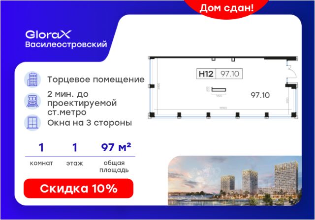 Продается офисное помещение - 60,85 кв.м. в премиальном проекте GloraX Premium Василеостровский.