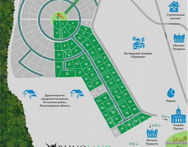 — В поселке, как жилые дома-проживают постоянно, так и дачные, поселок активно застраивается. Место отличное, как для дачного загородного отдыха, так и для постоянного проживания. Рядом автобусная остановка, парк через который ведет дорога к огромному красивейшему "Орлинскому" озеру по берегу которого расположены пляжные зоны. На озере Вас ждет не только отдых, но и рыбалка для любителей, в озере водятся раки. Вода там чистейшая- местность с родниками, на родник за водой ходят и проезжающие и местное население. Места здесь дивной красоты, как летом, так и зимой. Рядом грибные леса и звенящий чистотой воздух. У парка старинный действующий храм. Участок находится в непосредственной близости от основной социальной инфраструктуры. Детский сад, два продуктовых магазина, один сетевой магазин Магнит, пункт выдачи Ozon, почта находятся в деревне, в пешей доступности. Школы, сетевые и строительные магазины, банки в соседних населённых пунктах: городской посёлок Дружная Горка (4км.). Посёлок городского типа Сиверский (8 км.), Добраться до деревни можно с помощью автомобиля. На автобусе 505, 506, 506А, 507, 120 автобусные остановки рядом в пешей доступности.