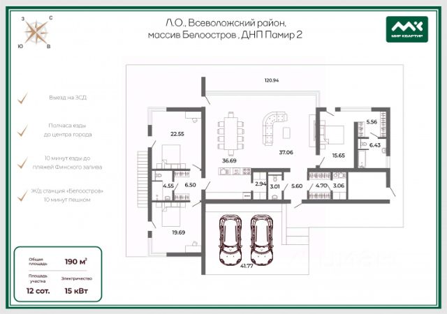Площадь дома - 190м2, в нем 3 спальни и 3 санузла, просторная кухня-гостиная с панарамными окнами и навес на две машины.
