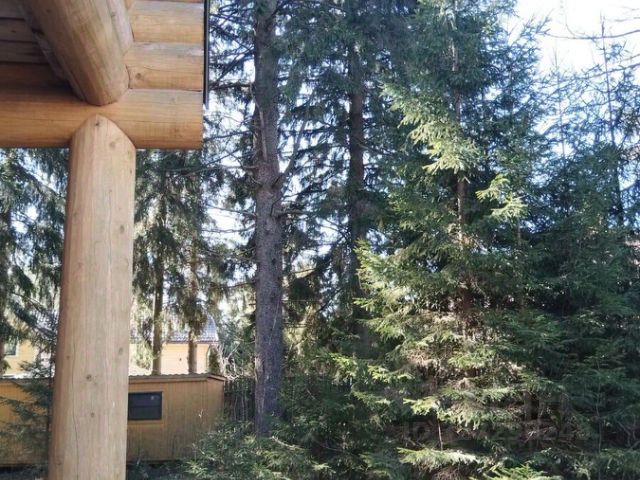Вокруг большие хвойные деревья, участок в лесном массиве, поют птицы