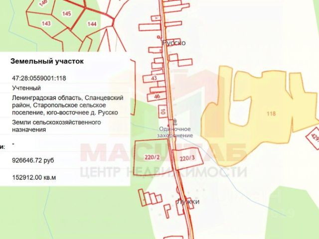 Хотите приобрести земельный участок? У нас есть отличное предложение - участок площадью 15.3 гектара в деревне Русско, Сланцевский район, Старопольское сельское поселение! Деревня Русско расположена в юго-восточной части района на автодороге 41К-163. Расстояние до административного центра поселения — 11 км. Этот участок является оптимальным вариантом для инвестиций. Благодаря своему расположению и потенциалу для развития, вы сможете получить отличную прибыль от его дальнейшей продажи или аренды. Не упустите уникальный шанс стать обладателем такого большого и перспективного участка! Звоните нам прямо сейчас! 15.3 гектар - это не просто земельный участок, это возможность для вашего успешного будущего! Покупайте с умом, инвестируйте в будущее уже сегодня! Номер объекта: #1/999854/331